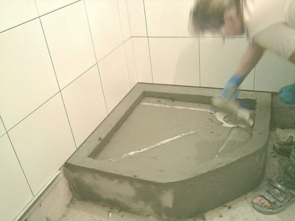 Перед заливанием раствора надо убрать напольное покрытие в зоне установки подиума, а затем поместить гидроизоляционный слой, соорудить каркас из арматуры и опалубки. Благодаря этому бетон обретет необходимую форму, а поверхность будет защищена от трещин. После этого процесса следует подобрать место установки слива. Чтобы создать бетонный раствор, потребуется взять цемент, песок и щебень (1:3:3), а затем добавить туда воды температурой +30°С…+45°С. После этого должна получиться консистенция густой сметаны.
