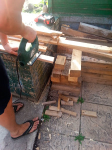 - Распиливаем доски электролобзиком на заготовки примерно одинаковой длины (по 25—30 см). Необязательно делать их именно такими, можно сделать и обычные квадратики разной высоты.