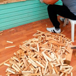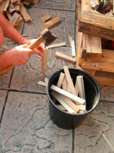 - Каждую заготовку разделяем топором, чтобы мозаика из дерева получилась тонкой. Чем больше будет отличаться толщина щепок – тем красивее будет результат.