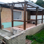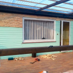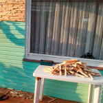 - В конце я решил покрасить деревянную мозаику морилкой под цвет домика и веранды.