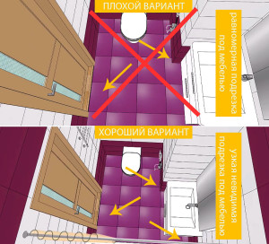 - Если в помещении будет ванная – расчёт делается на поверхности от стены до экрана. При этом под ванной также может быть продолжена укладка, но в видимой части нужно получить равномерные подрезки по краям.