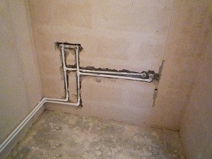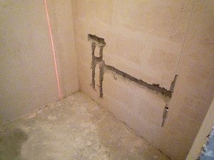 Проследите за тем, чтобы поверхность была максимально ровной. Трубы должны быть спрятаны, избавьте себя от необходимости отвлекаться в процессе укладки керамической плитки на стену. Плоскость позволяет обходиться минимумом клея и в несколько раз ускоряет облицовку. Выровненное основание прогрунтуйте, особенно тщательно, если стены оштукатурены.
