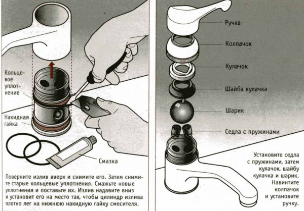 Шаровой картридж также имеет несложное устройство. Основной деталью в нем является шар с внутренними пустотами. Он имеет 2 отверстия, которые расположены сверху и снизу. Вода попадает непосредственно в шар, там и смешивается. Сам шар установлен на 2 резиновых элементах, так называемых «седлах», в каждом их них есть свои отверстия для прохождения воды.