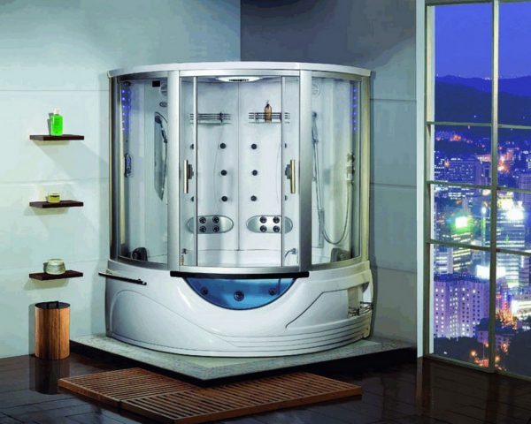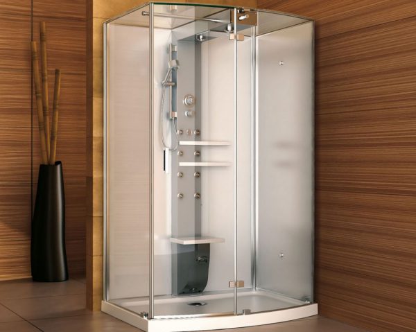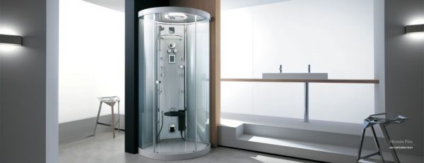 Цельная душевая кабина - Кабины комбинированного типа представляют собой бокс крупных размеров. Устанавливаются в ванных комнатах с площадью не менее 8 кв. м. Имеют глубокий поддон, заменяющий ванную. Это может быть джакузи или гидромассаж. Стенки из прочного стекла закрывают всю переднюю часть. Крыша может присутствовать или отсутствовать в зависимости от модели. Имеется душ Шарко, тропический или каскадный ливень. Многофункциональные кабины имеют высокую цену, что не каждому по карману. Это является основным недостатком. К достоинствам можно отнести: богатый выбор различных моделей, насыщенный функционал, возможность совмещать принятие ванны с душем.