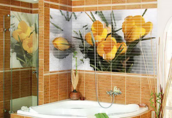 - Наборные панно. Панно – это картина, нанесенная на ка кафель с помощью фотопечати или вручную, она может состоять из одной или нескольких элементов. Обычно производитель включает панно в коллекцию керамической плитки, в которую входит покрытие для стен, пола, бордюры и другие варианты декора, выполненных в одном стиле, одного цвета. Использование панно делает интерьер более изысканным и дорогим;