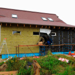 Стены «окутываются» в слой теплоизоляции: минеральной ваты или экструдированного пенополистирола. Утеплитель должен быть закреплён плотно к стене и без зазоров. Минеральную мату нужно подрезать точно по месту, чтобы не создавалось бугров по краям.