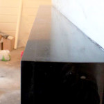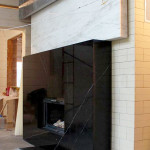 Далее укладываем облицовку на полку камина. По-хорошему углы нужно подпиливать под 45 градусов, тогда облицовка выглядела бы как монолит. Но расчёты и деталировку делал дизайнер, поэтому сделали по готовому проекту.