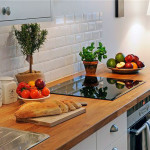 Плитка керамическая «кабанчик» укладывается на фартук обычно со смещением. Можно разнообразить общий вид включением в раскладку отдельных плиток с рисунком и обрамлением бордюрами.