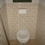 - Стены в туалете облицованы наполовину бежевым кабанчиком