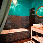 Но можно найти и интересные варианты, например, сочетание кабанчика шоколадного цвета и темно-бирюзовой краски на стене.