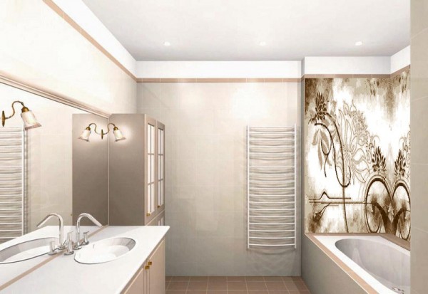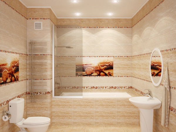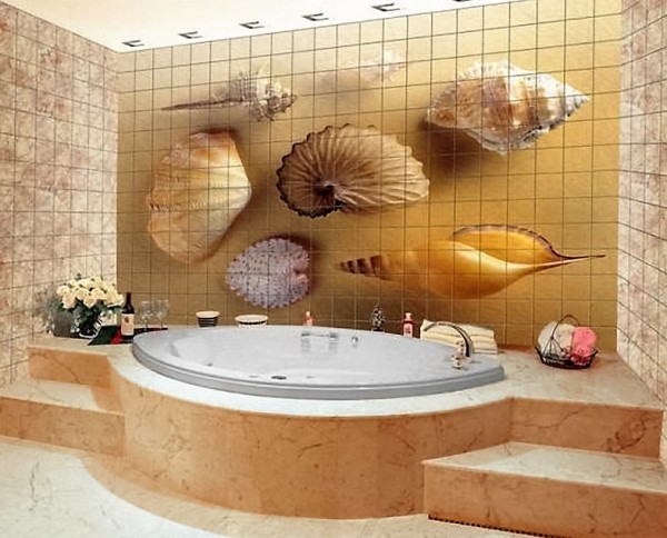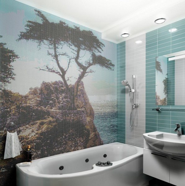 В ванной комнате панно из плитки маленьких размеров будет теряться на общей площади стены. Отчего для больших помещений лучше подбирать изображения в целую стену, иногда даже и в две. Кроме того, зачастую в ванное пространство подойдет любой рисунок, например, знаменитого художника или обычный натюрморт, а, может, и пейзаж.