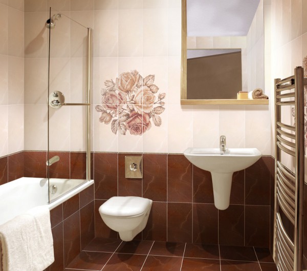 Хозяевам маленьких ванных комнат лучше всего остановить свой выбор на стильных, но при этом небольших рисунках. Можно даже использовать отдельные элементы, например, для того, чтобы выделить зону у раковины или самой ванны. Это позволит не только разбить пространство, но и визуально разгрузить помещение. Помимо этого, стоит рассматривать в качестве основной тематики отсутствие каких-либо сюжетов.