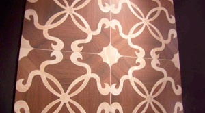 Отличного эффекта можно добиться, если использовать гидроабразивную резку плитки. Она позволяет нарезать любые формы и закругления. Что из этого можно получить – показано на фото. Отличить от резного паркета почти нереально, и это не рисунок – каждая деталь вырезана и уложена отдельно, как мозаика.