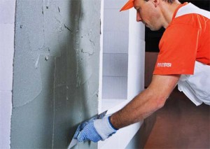 При необходимости стены выравнивают обычным раствором цемента с песком или строительной смесью, делается это широким шпателем. Для пола используют «наливные полы».