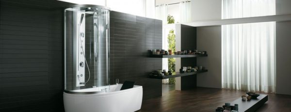 - Душевая кабина с ванной совмещаются максимально красиво. Если покупать эти приспособления в единой комплектации, то их сочетание будет выглядеть очень эстетично. Здесь возможны даже модели с изогнутыми, фигурными, непрямоугольными формами. Они великолепно вписываются в интерьер ванной комнаты, обустроенной в той или иной дизайнерской стилистике.