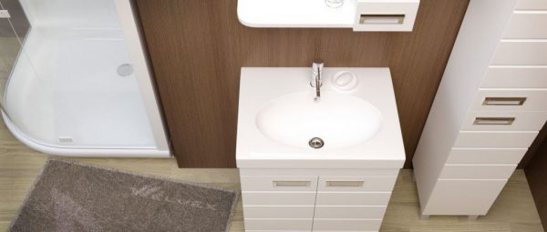- Угловое исполнение тумбы, в случае если комната для принятия водных процедур весьма невелика по габаритам.