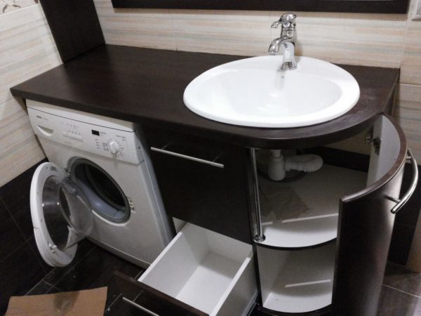 В случае, если закрепить приобретенный умывальник на тумбе стандартной модификации не представляется возможным, то следует сделать индивидуальный заказ на изготовление влагостойкой мебели под раковину в ванную под необходимые по проекту размеры и формы.