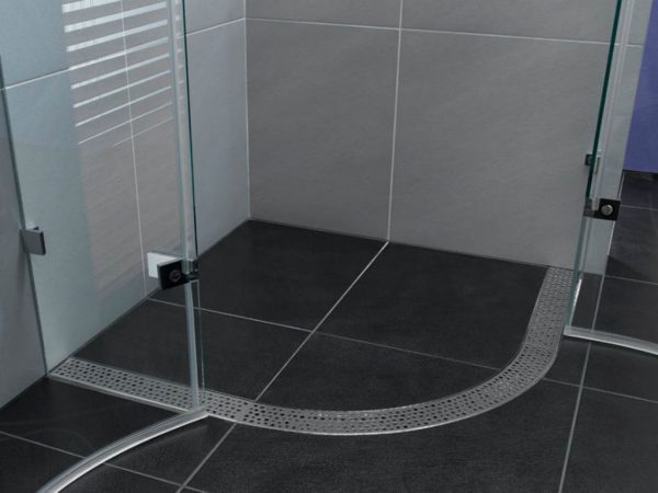 - Подготовленное основание залить еще одним слоем бетонной стяжки. Его поверхность нужно сформировать с небольшим уклоном (1-2°)в сторону решетки трапа, чтобы вода не растекалась по подиуму, а естественным образом перемещалась к точке слива в канализацию. По краям подиума можно сделать невысокие бортики, чтобы предотвратить расплескивание воды по полу санузла. Если планируется установка стеклянного ограждения со сдвижными дверцами, то на этом этапе может потребоваться и обустройство полозьев для них.