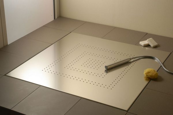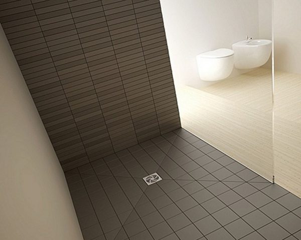 Принципы устройства душа без подиума ничем не отличаются от строительства такового на приподнятом участке пола. Первым шагом должна стать надежная гидроизоляция очищенного от старого покрытия и стяжки основания. В отличие от устройства подиума изолировать придется всю площадь ванной и нижнюю часть стен комнаты. Душевой трап нужно установить в удобном для хозяев месте. Обычно это дальний угол помещения: там кабинка не будет мешать ходить.