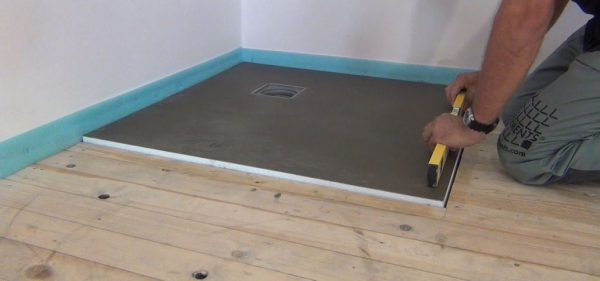 Сборка и подключение слива производится таким же образом, как и для подиума. После того как он установлен, можно определить высоту, на которую поднимется уровень пола, и смонтировать узлы подключения к канализации другой сантехники для ванной. Далее все происходит так же, как указано для устройства подиума: плиты ППС, стяжка из бетона, гидроизоляция и снова стяжка.