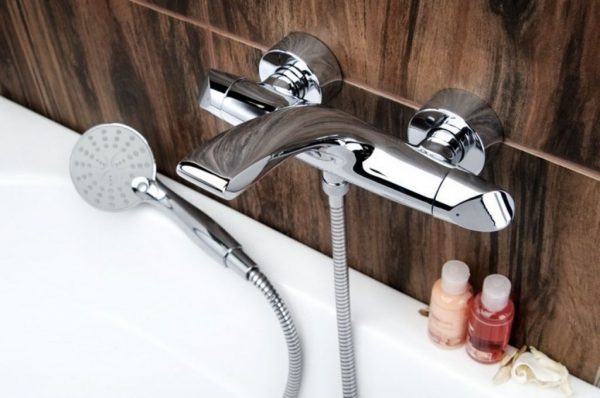 - К стене. Наружный смесители для ванны и душа крепятся прямо к стене ванной комнаты. Эти модели доступны по цене, разнообразны по дизайну, их легко монтировать и обслуживать. Достоинство таких моделей в том, что при поломке или выходе из строя оборудования его легко починить.