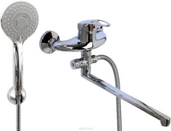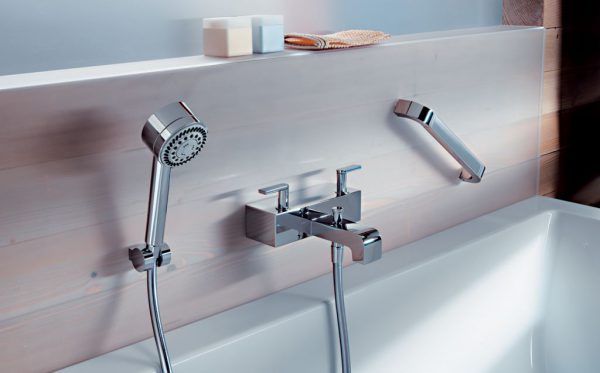 - Универсальные модели. В последнее время стали популярны универсальные смесители, которые используются и для набора воды в ванну, и для подачи воды в душевую лейку. Они очень функциональны и удобны для монтажа. Поставить прибор универсального назначения лучше на большем расстоянии, чем смеситель для ванны, оптимальная высота – 25 см.