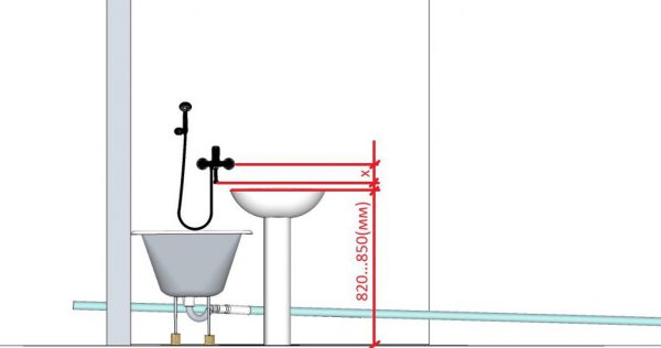- Затем нужно примерить смеситель по высоте. Если прибор душевой, то его размещают на высоте не менее 800 мм, если для ванны – на высоте 200 мм, а универсальные модели устанавливают на высоте не менее 250 мм.