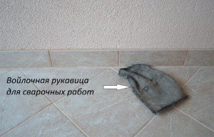 Оставляем облицовку подсохнуть и потом смахиваем белый налёт сухой чистой тряпкой. Удобнее всего это делать войлочной рукавицей.